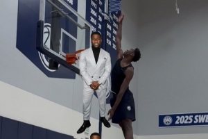 体育资讯7月31日讯 在最近一次杨百翰大学的训练中,AJ-迪班萨展示了他超强的弹跳。从图片中可以看到,迪班萨的垂直弹跳直接让他的头完全高出篮筐。